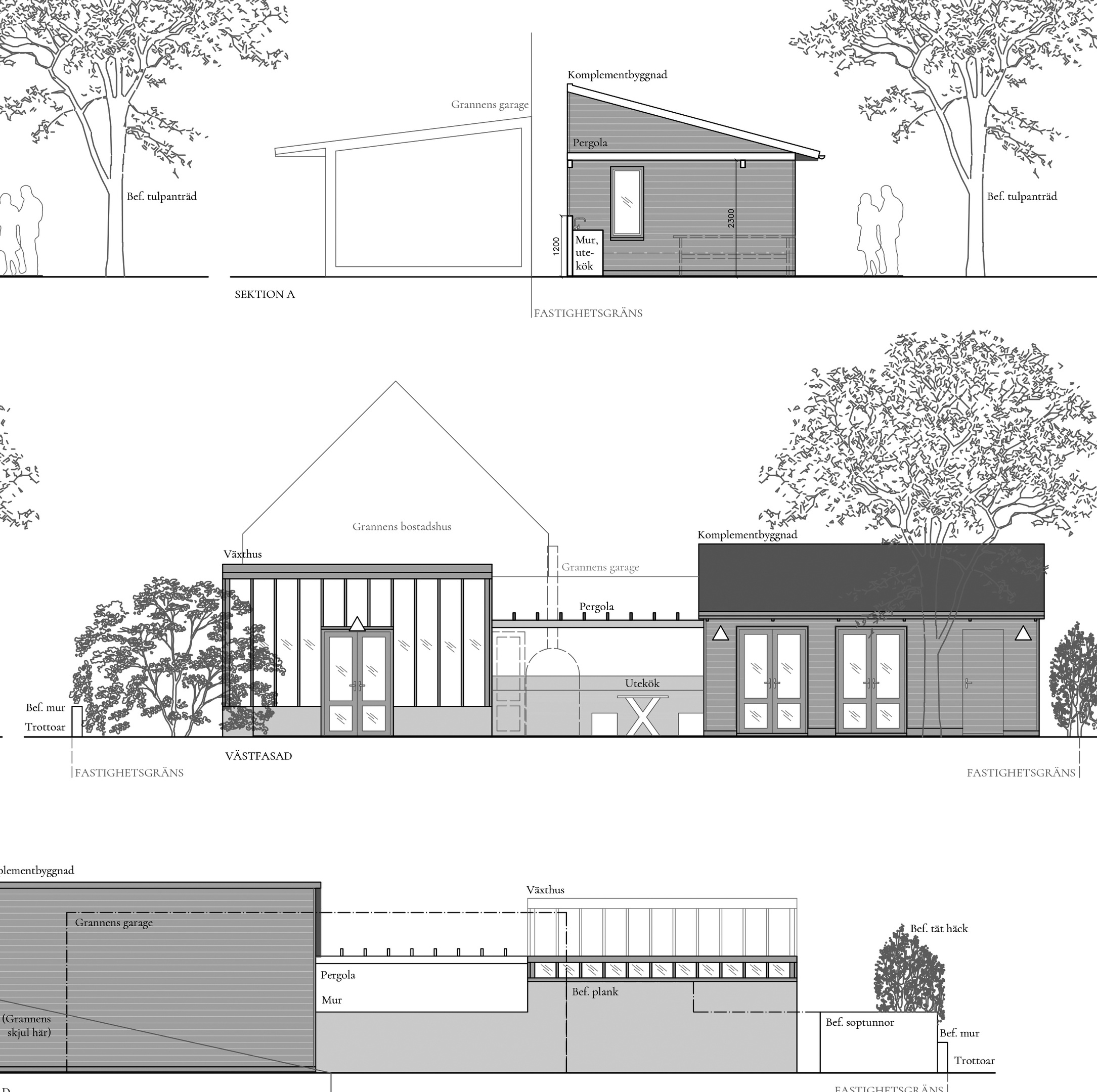 Nybyggnad av liten kontorsbyggnad, växthus, utekök och pergola i villaträdgård. De små volymerna passas in med grannskapets typiska komplementbyggnader, där takvinklar och materialval samspelar med grannhusen, skapar läsidor, soliga hörn och bästa förutsättningar för odling och samvaro.
