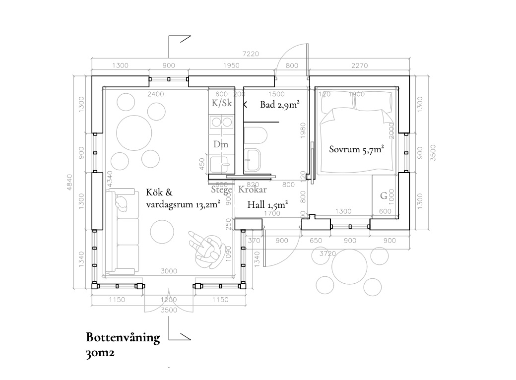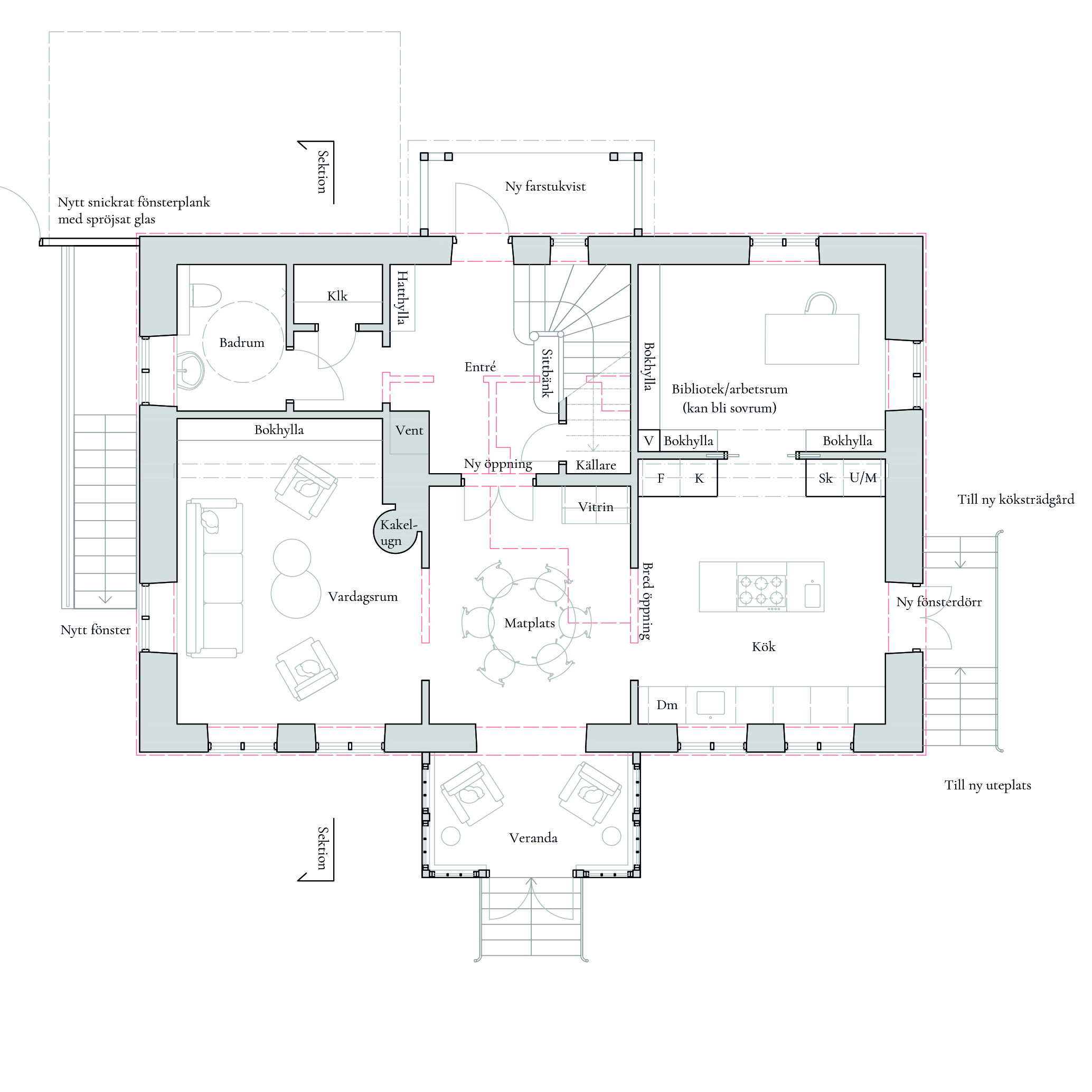 Rådgivning och utredning för möjliga planlösningar (och fasadingrepp) på mangårdsbyggnad från 20-talet i Kosta-trakten. Vald lösning innefattar en ny disponering av kök, groventré och tvättstuga, med målsättningen att alla förändringar på huset ska vara reversibla och bygga vidare på husets ursprungliga kvalitéer.