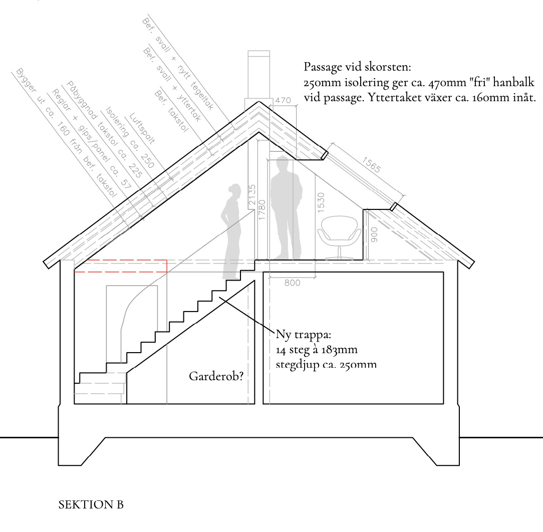 Detta fina lilla hus hade som så många andra en smal, brant vidstrappa som inte fungerade med en tilltänkt inredning av husets kallvind. Vi planerade en inredning av ovanvåningen och utformade en ny passande trappa, som fungerar fint trots en minst sagt begränsad takhöjd.