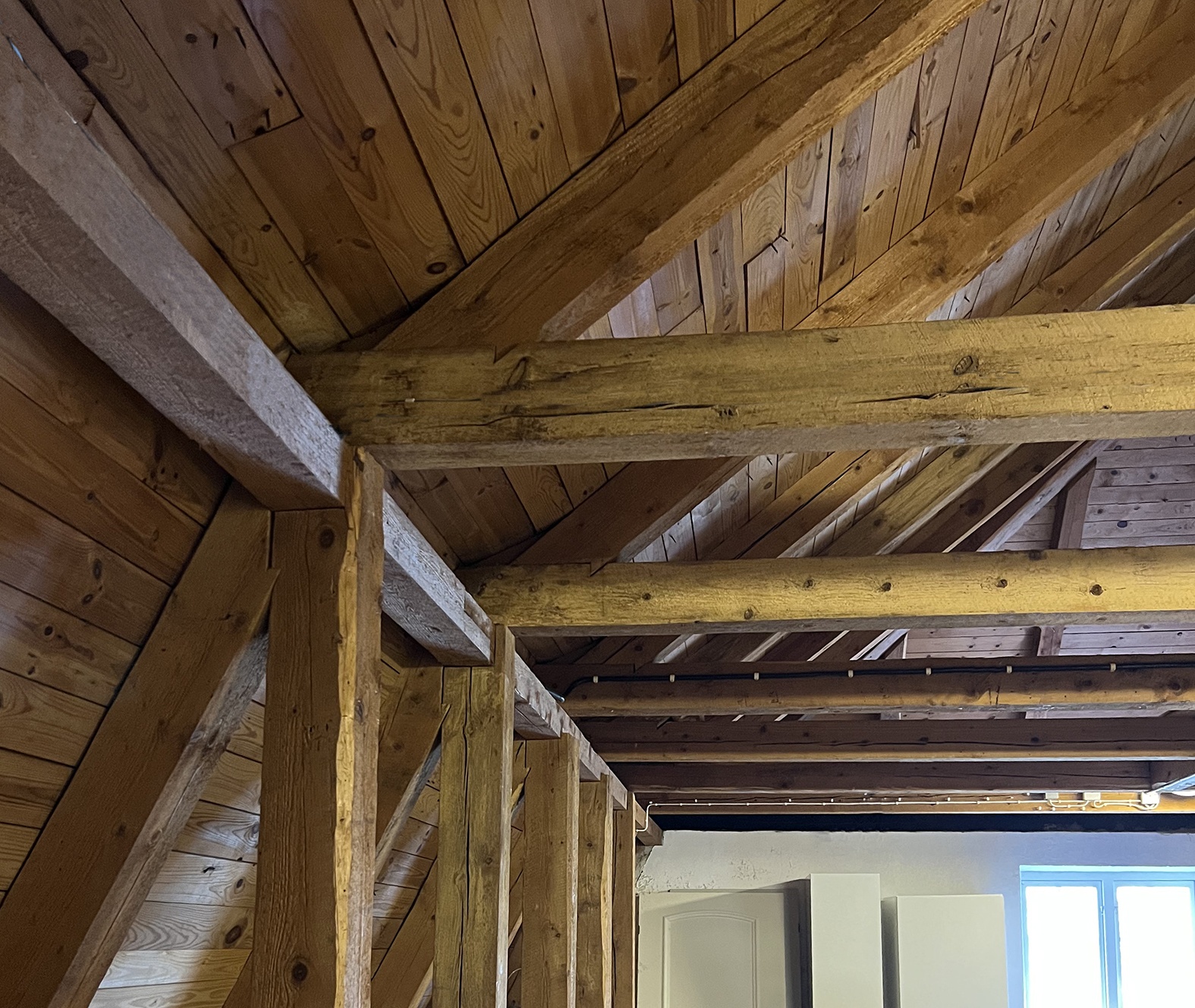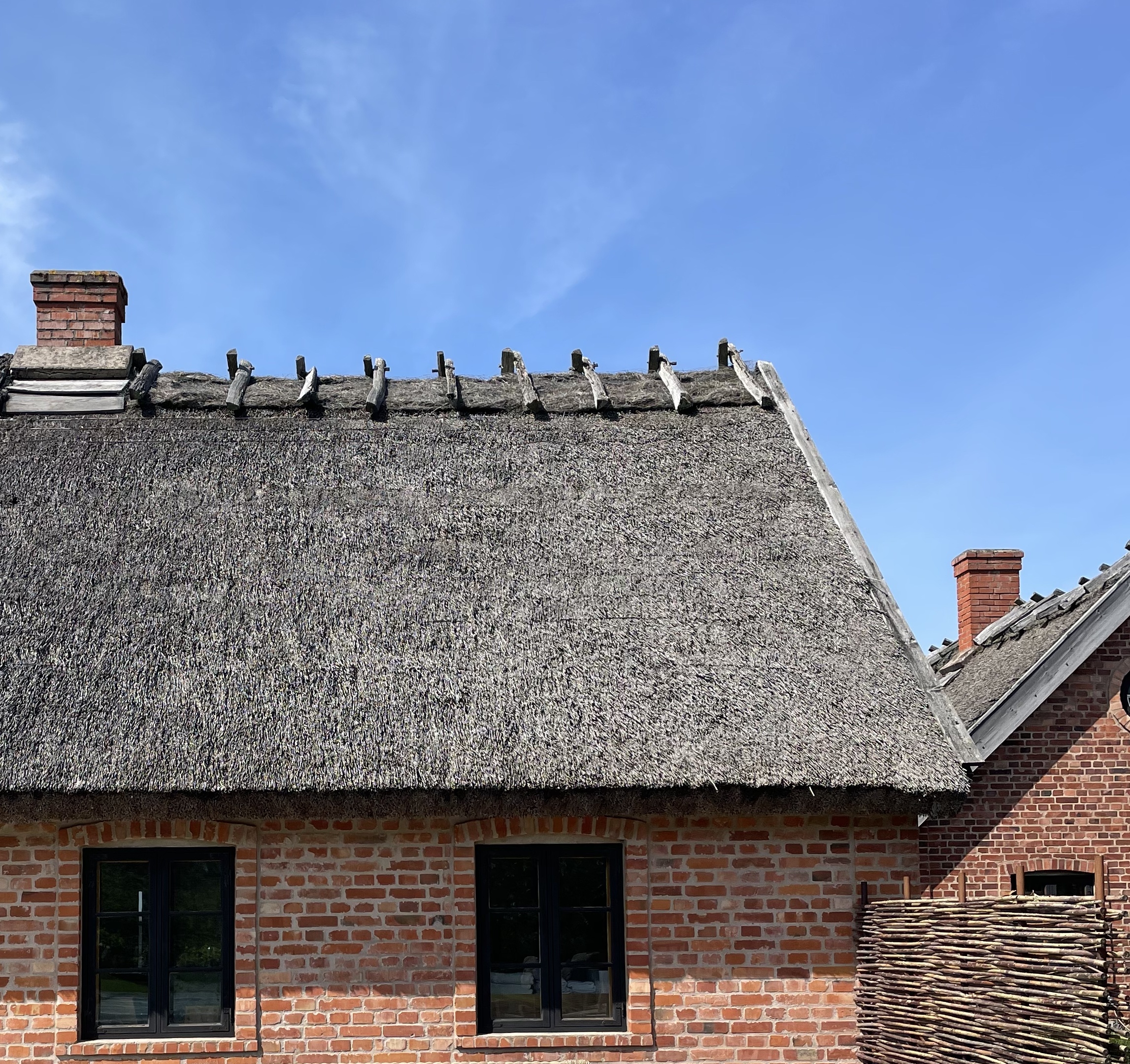 Dessa två hus bygdes för bara 20år sedan av en entusiast som höll sig helt nära korsvirkes-traditionen (inte en spik i sikte, bara dymlingar) med ett otroligt hantverk i grunden. Husen ges nu en total översyn med nya stråtak, ytskikt, badrum, kök, inredningar, belysning och ny trappa. En modern tillbyggnad planeras under året, med en uttalad önskan om något som bryter tvärt i stil, men likväl harmonierar.
